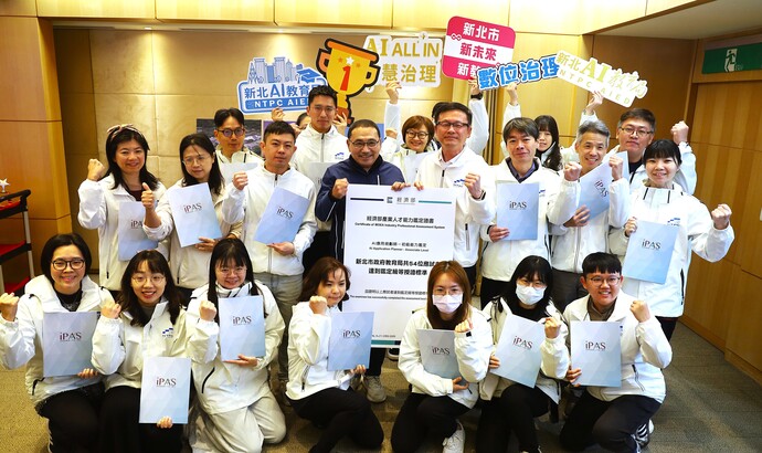 人才培育方面,教育局透過趨勢講座、基礎實作、新人訓練、種子培力及Podcast小課堂等五大增能管道,讓主管具備前瞻視野,也讓同仁能針對業務痛點靈活運用AI。 目前各同仁已建置650個AI機器人,協助內部行政與對外諮詢,實現「人人都有AI秘書」。 2025年90位同仁及校長團體報考「經濟部AI應用規劃師初級鑑定」,共54人考取,通過人數為全國政府機關第一,通過率達60%,高於全國平均38%;並且90位幹部全數通過GeminiAI認證,展現新北在公部門AI人才培訓上的領先布局。