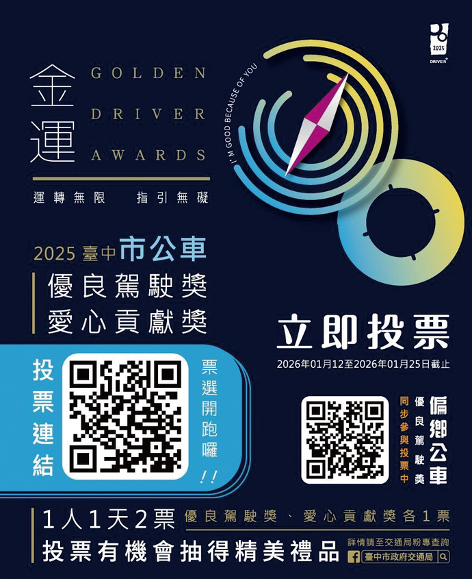 【記者張漢英/台中報導】為讓長年默默付出的公車駕駛被更多人看見,中市公車優良駕駛金運獎表揚,今年海選活動開跑,透過手機或網頁連結進入活動平台,即可投下鼓勵的一票,投票期限至25日,一起用行動支持這群每天為城市奔走的方向盤英雄。
