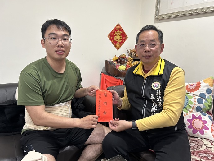 【記者林富貴/新北市報導】今(4)日下午,新北市軍人服務站站長吳遠里前往新莊探視甫捐肝的中士賴奕誠並致送慰問金;陸軍馬祖防衛指揮部通資作業連中士賴奕誠平日戍守崗位、保家衛國,展現軍人堅毅與責任感;在家庭面臨重大考驗之際,他更以實際行動詮釋「忠孝並行」的真諦。
