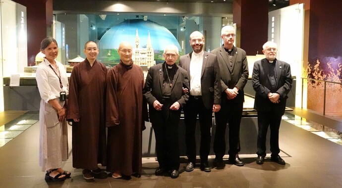 顯月法師等熱忱接待,引領貴賓穿梭於全球信仰的歷史長河中。 一行人自「百千法門,同歸方寸」八字箴言啟程,經「水幕牆」、「朝聖步道」到「手印牆」,進入「金色大廳」與「世界宗教展示大廳」,一行人透過多元宗教文化與建築模型展示相當讚賞。 也對正在「方寸之間」展出的《僧人眼中的梵蒂岡》攝影展非常感興趣,駐足觀看良久。