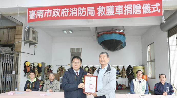 【記者吳淑華/台南報導】台南市緊急救護量能再升級!在地企業鑫興鋁業股份有限公司董事長謝添寶,秉持回饋鄉里精神,捐贈台南市政府一輛價值新台幣約400萬元的高規格救護車,將配置於消防局第二救災救護大隊官田分隊使用,以強化官田及周邊地區的緊急醫療量能。 捐贈儀式在官田消防隊車庫前廣場舉行,由市長黃偉哲代表受贈並回贈感謝狀,肯定企業善盡社會責任的具體行動。