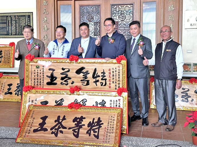 圖:南投縣茶商業同業公會主辦的「114年冬季暨全國冬片茶比賽茶」特等茶王開罐儀式合影。 (記者李光曜/攝)