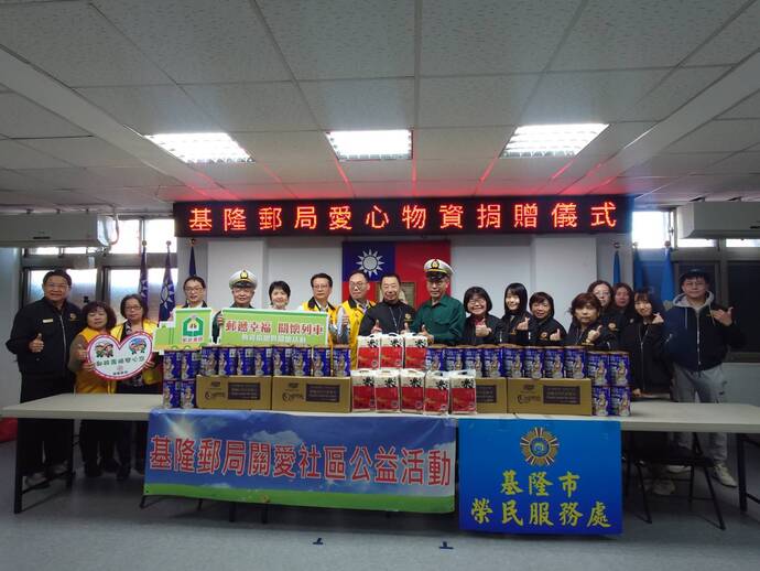 【記者林富貴/基隆報導】在春節前夕,基隆郵局及心蘭愛鄉生活發展協會於今(4)日上午,分別蒞臨基隆市榮民服務處捐贈物資,對基隆地區榮民眷表達關懷;基隆郵局由吳聰明局長率主管及同仁捐贈榮服處營養品及大米物資一批,委由榮服處轉發給亟需要生活照顧的榮民眷;心蘭愛鄉生活發展協會則由劉元清理事長、基隆市建國里王雅蘭里長及協會成員,一同捐贈愛心拐杖傘一批,表達對榮民眷的誠摯關懷;兩單位受到榮服處方正處長率同仁的熱情接待,並舉行了簡單隆重的捐贈儀式,方正處長代表受贈,並回贈感謝狀及紀念品,表達誠摯謝忱。