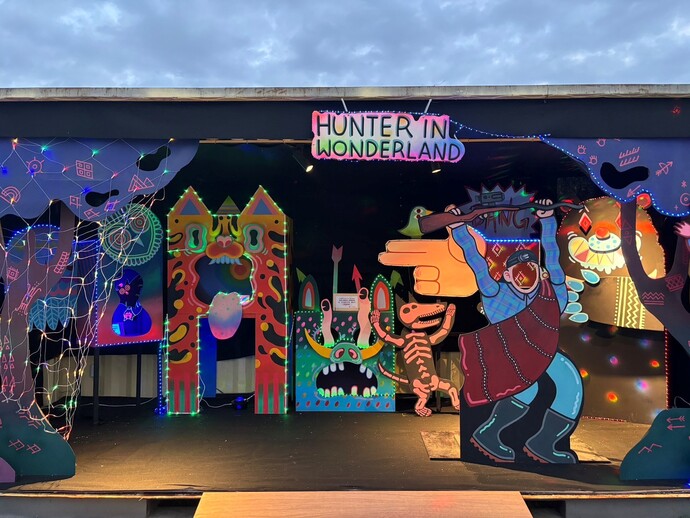 在一次次進入山林的過程中,蔣沛珊YabunYuma慢慢察覺,過去熟悉的獵徑變得模糊,動物的足跡愈來愈少,原本的棲地被道路與經濟開發切割分段。 這些親身經驗,成為《獵人的山林奇遇》創作基礎,現場動物燈飾錯落於貨櫃屋內的舞台,如同一場無聲卻持續上演的山林故事。 每件作品旁皆附有文字說明,介紹動物們所面臨的棲地流失、環境破碎與人類活動衝擊等議題,在童趣與光影交織的氛圍中,引導觀眾在賞燈之餘放慢腳步,重新思索人與自然之間的距離與責任。