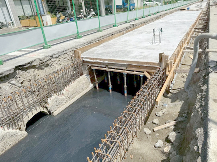 工程重點涵蓋箱涵頂板重建及箱涵側壁修補,針對老舊頂板破損、鋼筋裸露嚴重之段落,進行打除與重建,並於側牆混凝土剝落處進行補強,透過專業的表面處理與修復材料,有效強化結構穩定性。