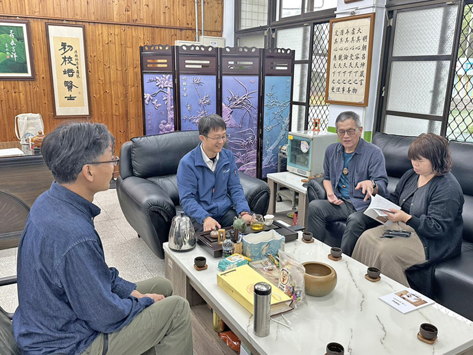 圖:冠中專利商標副總經理臧瑞明徒步環島夢想實現蒞臨初鄉國小經驗分享與初鄉茶間負責人朱怡甄及張東盟校長交流。 (記者李光曜/攝)