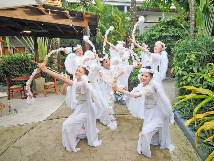 有別於過往的展演,此次天使展演特別融入了「天使弓箭」;弓箭的箭鏃以心型呈現,象徵將愛與和平的種子用心精準而深遠地傳遞出去。 在巴哈馬演出前的彩排,當展演的天使們面向晴空揮動羽翼時,那份純淨的能量再次洗滌了她的心。