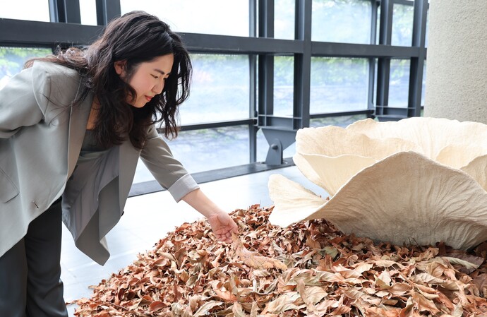 《(非)自然裡的方言》作品透過感測苔蘚的微弱電流變化,將其轉譯為聲音,聲音隨環境與觸碰而改變,使不可見的生命能量成為可聽見的時間流動,形塑人與植物之間的動態關係。 藝術家分享,當意識到「宇宙從我心中生起」時,並非瞬間的頓悟,是在日常觀察與創作累積中逐漸形成的內在力量,也是心靈得以安放與舒展的狀態。 《有光落下的季節》展場中真實落葉與超擬真陶瓷落葉混合堆放,空氣中隱約瀰漫枯葉氣息,虛實交錯的佈展手法增添自然氛圍,也邀請觀眾細細尋找其中差異,在觀看中發現趣味。