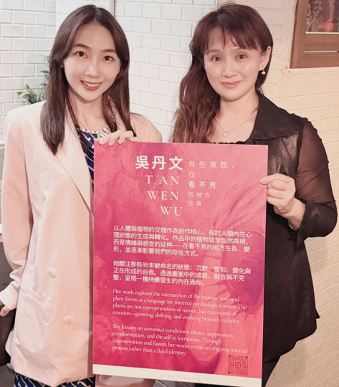 資深媒體主持人楊心怡表示,從東京回到台北,吳丹文透過去臉孔化的人體與植物共生意象,描繪未被命名的心理狀態與自我轉變」