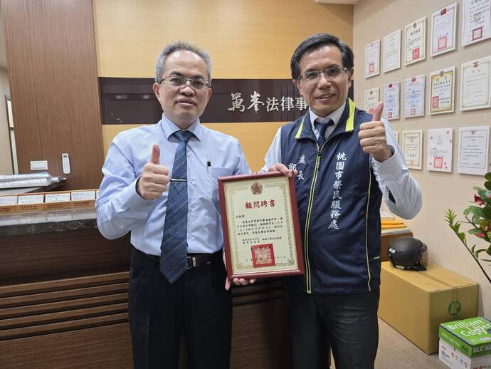 【記者林富貴/桃園報導】持續強化榮民及眷屬法律服務資源,桃園市榮民服務處處長鄭源敏於今(30)日專程前往萬峯法律事務所,拜會蕭萬龍大律師,並頒發法律顧問聘書,肯定其律師團隊多年來無償投入法律諮詢服務,協助榮民眷妥善處理各類法律事務,成為本處重要的專業後盾。
