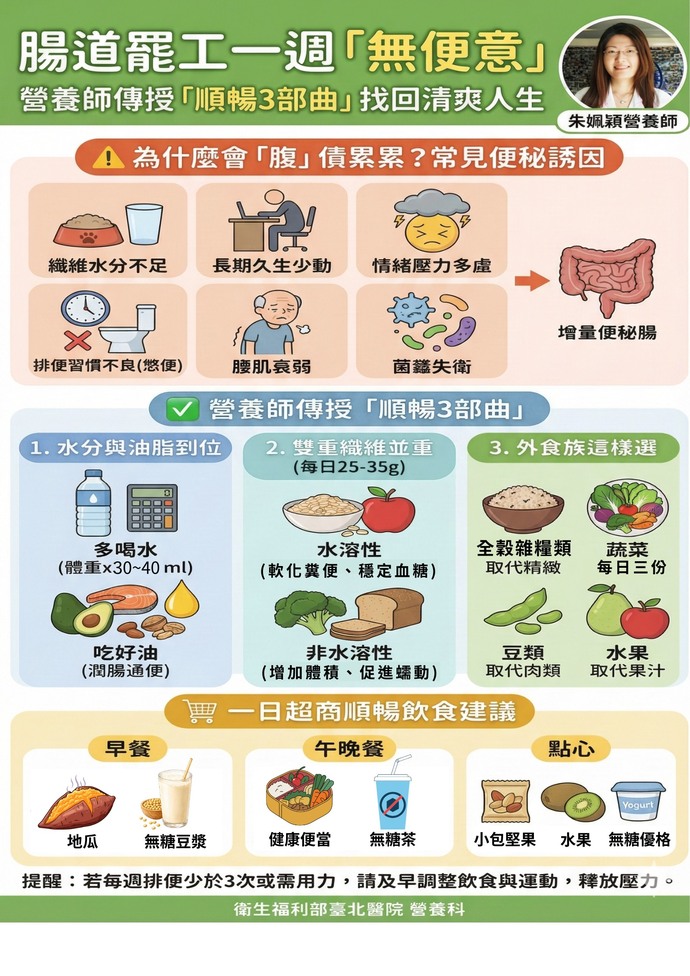 【記者林富貴/新北市報導】由於現代人生活節奏快,一不小心就成了「腹」債累累的受害者。 衛生福利部臺北醫院營養科朱姵穎營養師分享,一名40歲的職場婦女長期在公司與家庭之間「蠟燭兩頭燒」,身心俱疲導致生理時鐘大亂。 為了省時間,三餐經常只吃麵包或超商便當充飢,忙起來甚至忘了如廁,最久竟長達一週都沒有便意感,直到尋求營養飲食調整才找出問題核心。