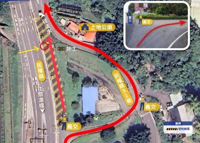 因適逢下班時間,提醒用路人往淡水方向車輛行駛民權路外側車道或改道「民權路92巷」通行,以策安全。
