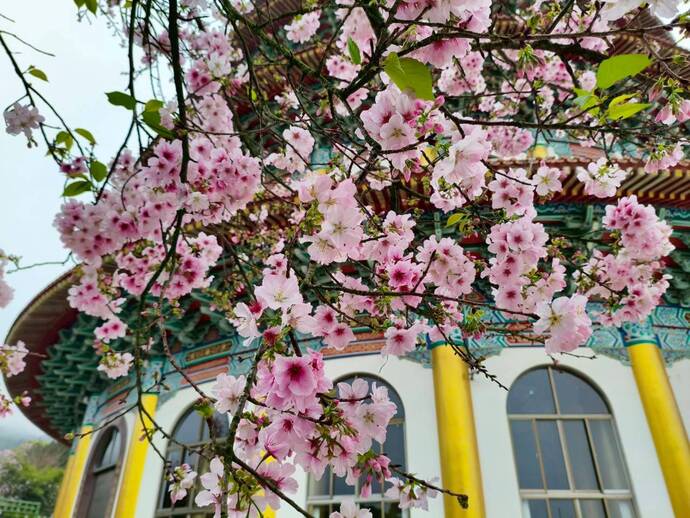 而提及淡水賞櫻景點,當然絕不能錯過最知名的天元宮。 不同於每年春節前盛開的三色櫻桃粉爛漫,3月中下旬起登場的吉野櫻,以白色單瓣花朵層層綻放,圍繞著五層圓形「無極真元天壇」建築,搭配遠山景色,構成春季限定的經典畫面,是攝影愛好者與賞花民眾朝聖熱點。 微風吹拂時花瓣輕舞,更為畫面增添夢幻氛圍。 大家可以搭搭乘捷運至淡水站,轉乘866、875、876、877號公車;或於紅樹林站轉搭淡海輕軌至淡金站後轉乘公車前往。