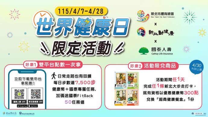 在新北市體育總會理事長蔣根煌積極協調與整合下,成功串聯公私部門資源,透過活動連結機制推動跨平台合作,民眾只要每日累積步數達7,500步,即可同時獲得「新北動健康APP」健康幣及「國泰人壽APP」任務點數。 除了雙平台回饋,衛生局在新北市體育總會的支持下,加碼推出「超商健康餐盒」限兌獎勵。 民眾只要於115年4月7日至4月28日活動期間,完成任1條「新北大步走路線」打卡,即可取得資格,以優惠健康幣兌換健康餐盒1份,鼓勵市民透過實際行動累積健康成果。
