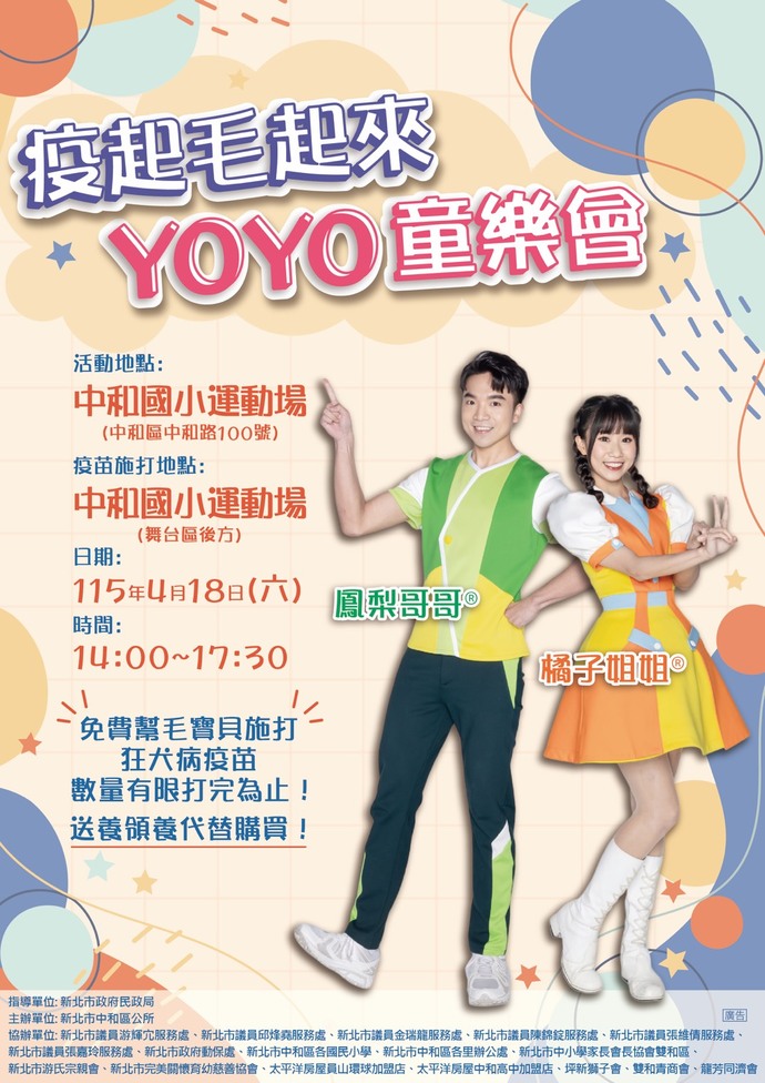 【記者林富貴/新北市報導】中和區公所歡慶兒童月,訂於115年4月18日下午2時假中和國小辦理「疫起毛起來YOYO童樂會」活動,提供親子家庭還有家中毛寶貝一同共度歡樂又能傳遞愛心的美好時光。