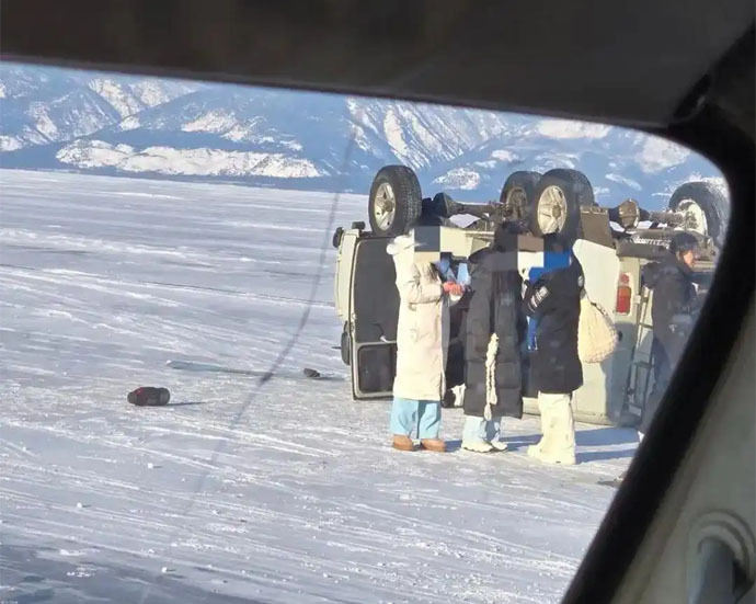 當日在奧利洪島附近的貝加爾湖區域冰面上,一名司機駕駛車輛運送中國遊客時不慎駛過冰層裂縫,導致翻車。
