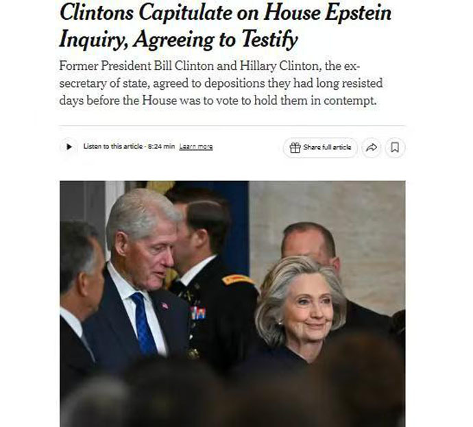 【記者林璟坤/外電報導】據美國《紐約時報》報導,當地時間2日,美國前總統、民主黨人柯林頓及其妻子希拉里同意在國會眾議院對愛潑斯坦案的調查中作證。