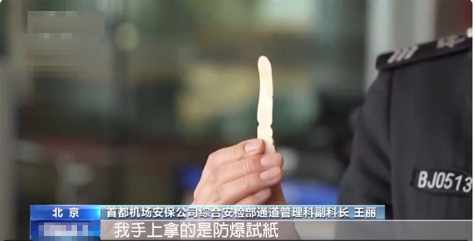 北京首都機場安保公司綜合安檢部通道管理科副科長王麗說:我手裏拿的這張試紙是我們的防爆檢測試紙,在工作中,通過試紙在旅客和工作人員的衣物表面、拉杆箱、雙肩背和電子設備上擦拭取樣。