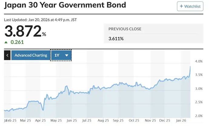 ↑圖說:財政擴張恐慌疊加20年期國債拍賣需求疲軟,日本國債遭遇歷史性拋售,日本30年期國債收益率上升26.5個基點至3.875%;日本40年期國債收益率上升27個基點至4.215%續創歷史新高(供圖)。