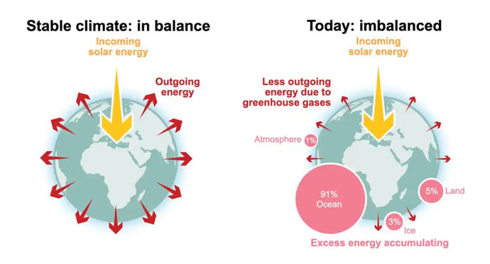 地球能量失衡是指太陽輻射進入地球系統的能量與離開地球大氣層的能量之差,如果進入地球系統的能量大於離開地球大氣層的能量,就意味著大量熱量累積在地球系統中。