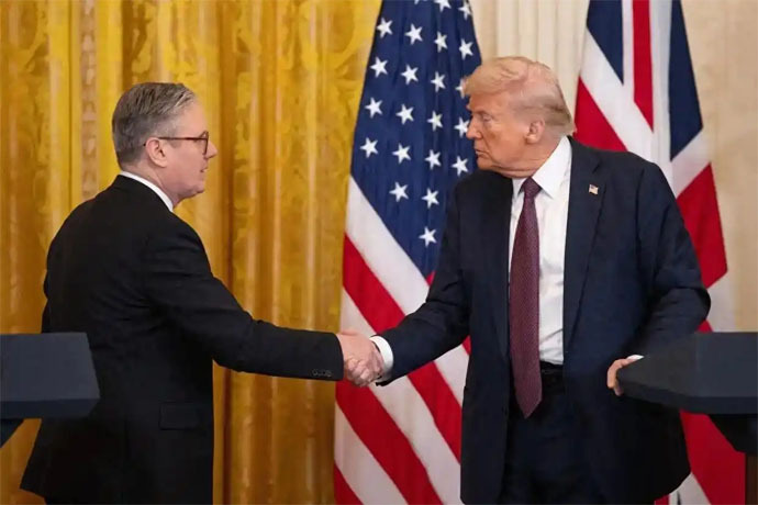 ↑圖說:美國總統川普與英國首相斯塔默握手(資料圖)。