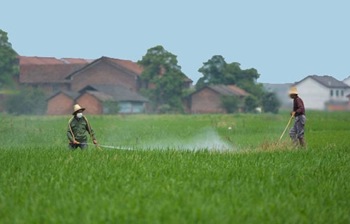 ↑圖說:農民正在對水稻噴灑農藥(資料圖)。