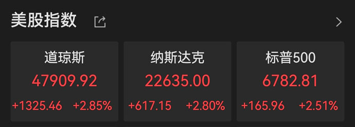 【記者林璟坤/外電報導】美東時間周三,美股三大指數高開高走,截至收盤,道指漲2.85%報47909.92點,納指漲2.8%報22635點,標普500指數漲2.51%報6782.81點。