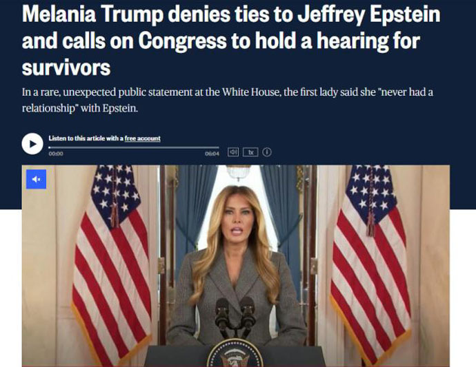 據《華爾街日報》報導,梅拉尼婭當天在白宮發表聲明稱,“那些將我與聲名狼藉的愛潑斯坦聯系起來的謊言必須在今天結束,那些散布關於我的謊言的人毫無道德標準、毫無謙卑之心,也不懂得尊重他人”。