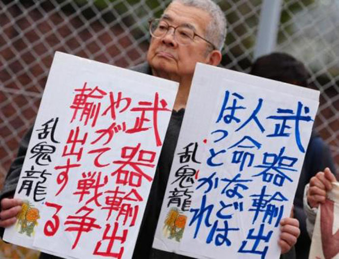 日本民眾抗議放寬武器出口限制 抗議者手舉寫有“不要出售‘日本製造’的武器”“不要戰爭”