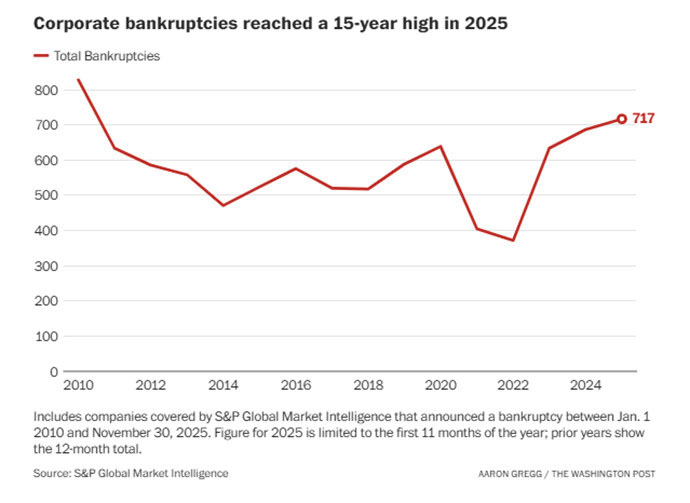 【記者林孟論/外電報導】美媒近日刊文稱,由於依賴進口的企業承受了數十年來最高的關稅壓力,今年美國企業破產數量激增,文章援引標普全球市場情報數據顯示,截至2025年11月底至少有717家公司申請破產,達到2010年以來的最高水平。