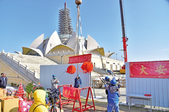 圖說:大安港媽祖文化園區媽祖雕像上梁,預計今年第3季登基亮相。 (中市新聞局提供)