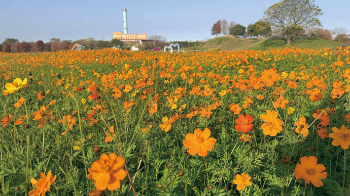 【記者張奕晴/台中報導】台中市后里環保公園花海繽紛。 建設局於園區種植約3,000平方公尺的黃波斯花海,1月中旬陸續盛開;2月再推出約5,000平方公尺的向日葵花海,金黃色花朵在冬日陽光映照下燦爛綻放,為園區鋪展出一片溫暖明亮的花毯。