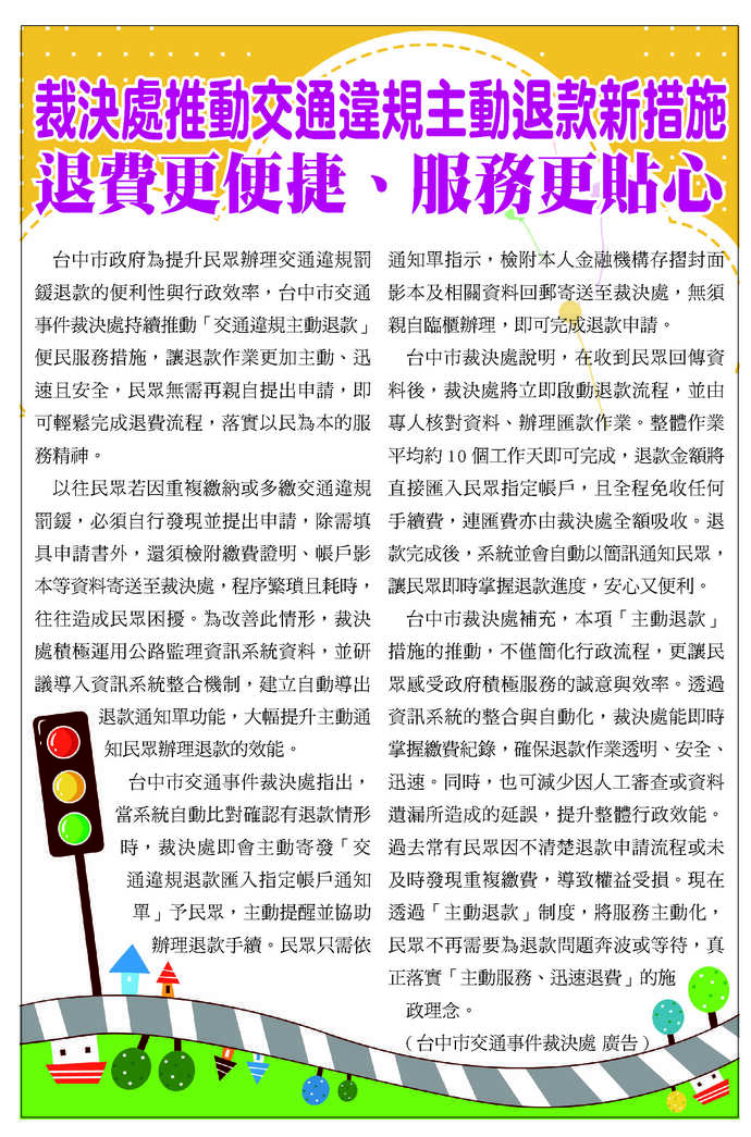 台中市裁決處補充,本項「主動退款」措施的推動,不僅簡化行政流程,更讓民眾感受政府積極服務的誠意與效率。