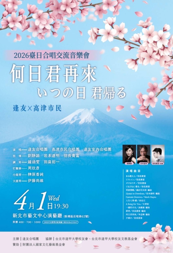 【記者林富貴/新北市報導】促進台日文化藝術交流,深化合唱音樂之美,逢友合唱團將於2026年4月1日(星期三)晚間19時30分,在新北市板橋區藝文中心演藝廳隆重舉辦「2026『何日君再來』台日合唱交流音樂會」。 本場音樂會由劉靜諭老師領軍指揮,率領「逢友合唱團」,攜手日本信長貴富老師所帶領的「高津市民合唱團」同台演出,共同呈現一場跨越國界、融合情感與文化的音樂饗宴。