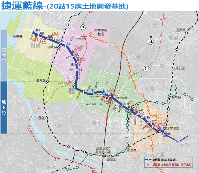 捷運藍線全長24.78公里、設置20座車站,路線橫跨市中心、海線及主要產業聚落,是台中軌道交通的核心路廊之一。 龍井機廠用地取得狀況目前已近乎全數到位,沿線規劃的15處土地開發基地也同步推動,可望帶動地區發展與整體城市機能升級。