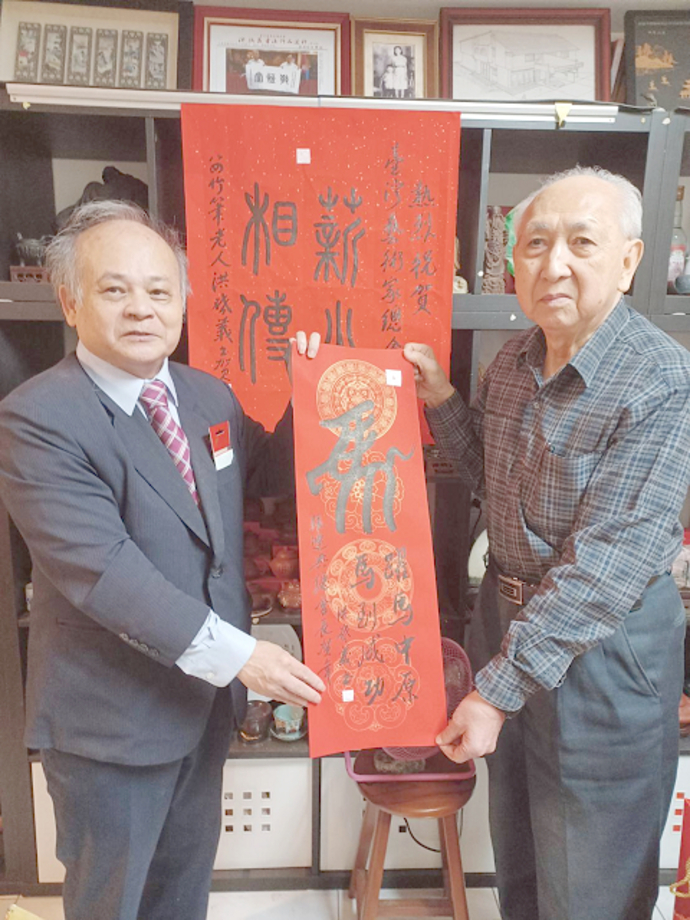 圖:台灣非營利組織聯合總會榮譽會長張連興拜會竹筆書法大師洪啟義,互祝馬年行大運。 (記者廖武龍攝)