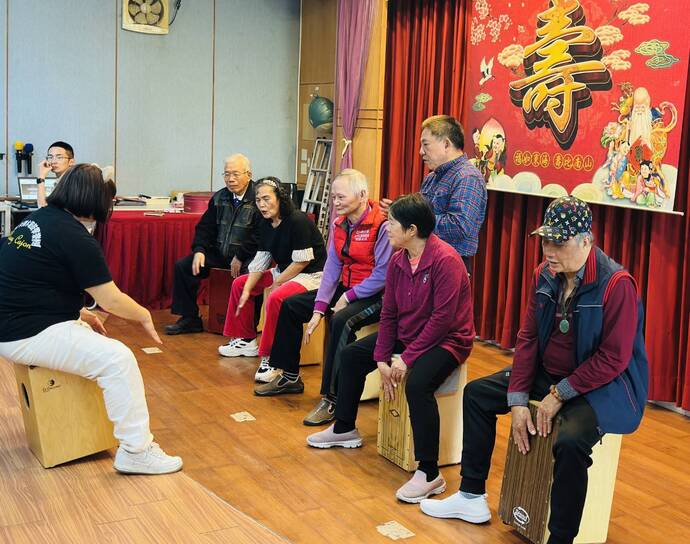 阿睞卡鬨木箱鼓擊樂團阿木兒老師分享,「阿睞」在族語中代表感恩,「卡鬨」則是木箱鼓之意,希望透過木箱鼓,用雙手的溫度敲出節奏,讓音樂發光發熱,並將這份溫暖與祝福傳遞給長輩,為大家增福添壽。 活動中也特別開放長輩上台體驗木箱鼓,在老師熱情帶動下,長輩們隨著節奏輕拍鼓面,臉上洋溢開心笑容,展現滿滿活力。