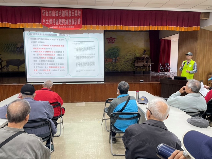新北市農業局長諶錫輝說,新北市水土保持服務團有專業且熱心的技師,提供農民各項輔導及專業諮詢,114年度更辦理24場農地水土保持處理維護及相關法規講習會,宣導山坡地水土保持重要性,協助農民建立正確水土保持觀念,確保山坡地農業安全與永續發展,今(115)年也將持續推動水土保持觀念,民眾如有山坡地開發或水土保持處理及維護相關問題,可立即透過新北市政府農業局網站(https://reurl.cc/60ol8r)線上預約或於每週一、四上午撥打免費諮詢專線02-2965-9930,新北市水保服務團提供免費水土保持專業諮詢,於新北市府大樓提供駐點服務解答民眾水保相關問題,歡迎多加利用!