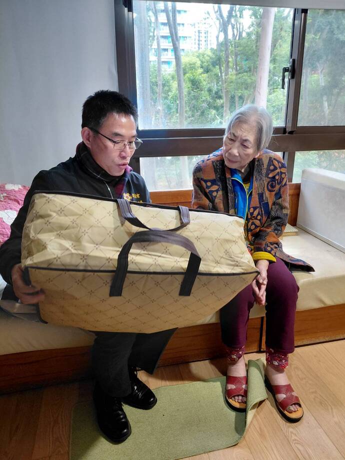 臺北市榮服處在農曆春節前主要探視獨居或生活支持系統較為薄弱的遺眷長輩,其中84歲劉婆婆因其子亡故,目前獨居,有失智、高血壓、糖尿病等慢性病,行動力不佳,平日聘有看護協助生活起居,並已安裝市府緊急救援系統,避免意外發生;另一位遺眷陳老太太今年80歲,為低收入戶,於松山區健康公共住宅租屋,患中度精神障礙,且其子亦具輕度智能障礙,因照顧母親無業,列為三節慰問發放對象,暫緩其困窘。