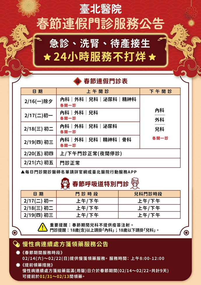 為因應春節期間呼吸道疾病盛行,臺北醫院同步加開「春節呼吸道特別門診」,於2月17日至2月19日(初一至初三)提供成人與兒科上午、下午門診服務,協助分流呼吸道症狀病人,讓有呼吸道症狀的民眾能更快分流看診,縮短等候時間,獲得更即時、安心的醫療照護,同時也能降低急診壓力,提升整體就醫效率。