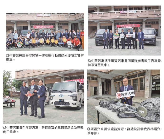 中華汽車部長吳岳峯表示,受馬太鞍溪堰塞湖溢流影響,光復商工災損高達2億元,除了政府的力量,中華汽車結合經銷商匯豐汽車的廠務資源,即時提供近30件汽車零件及3台實習用車,不僅能協助學校對應技職競賽要求的油車(菱利、JSPACE),強化汽車科學子手作能力,中華汽車也特別捐贈新上市的ET35電動商用車,並計畫性導入專業師資協助學校接軌新能源車的未來。