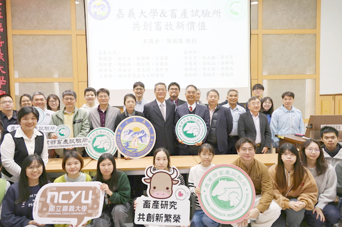 【記者廖淳曼/嘉義報導】嘉義大學與農業部畜產試驗所長期維持緊密的合作關係,2022年4月28日正式簽署合作備忘錄。 在嘉大林翰謙校長與畜試所黃振芳所長共同擘劃下,雙方於2024年啟動「永續創生聯合研究計畫」,以整合學術研發能量與實務應用資源,補強彼此的研發缺口。 這項長期布局正迎來開花結果時刻,今(30)日雙方於嘉大動物科學系視聽教室舉辦成果發表會,發表具備商業化潛力的革命性飼料添加物技術,共同見證臺灣畜牧產業邁向永續發展的新里程碑。