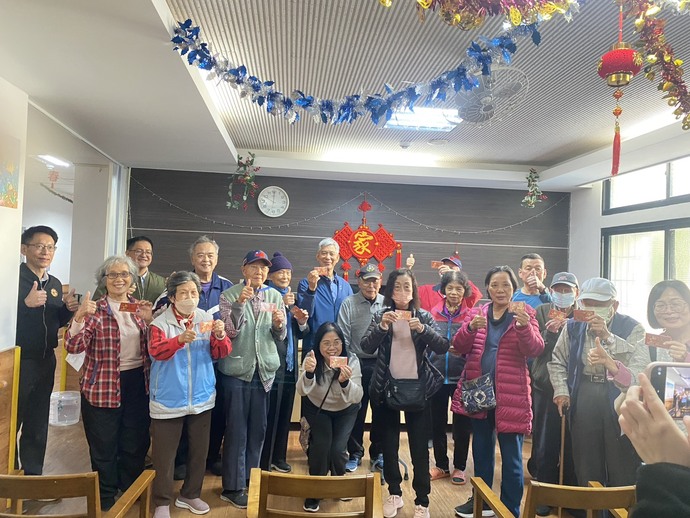 在活動當天,各住民房舍亦精心布置年節裝飾,懸掛春字吊飾、紅燈籠與吉祥春聯,營造熱鬧喜慶的過年氛圍。 主任與主管團隊除發送賀卡外,也逐一關心長輩生活起居與身心狀況,傾聽長輩分享在榮家的生活點滴。 有長輩珍惜地表示,「收到主任親自發送的賀卡,內心相當感動,也期盼新的一年平安健康、好運連連!」長輩們也紛紛邀請榮家團隊同仁合影留念,彼此祝福新春如意,展現榮家如同大家庭般的溫暖情誼。