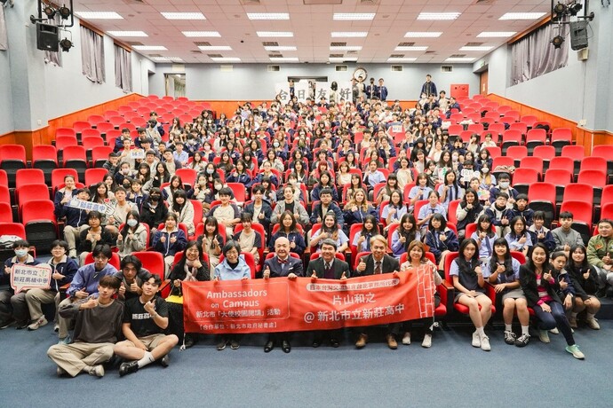 新莊高中謝金城校長說,新莊高中與日本交流頻繁,除113年起每年赴日本教育旅行,於熊本縣、愛媛縣、福岡縣等地的學校進行參訪,更於今(115)年1月與福岡市立女子高校簽署合作協議書,深化兩校友誼。 這次全校師生都很高興片山代表能蒞臨演講,透過代表精彩的分享,讓學生們了解外交官的工作,也從不同角度更加認識與台灣有深厚情誼的日本。