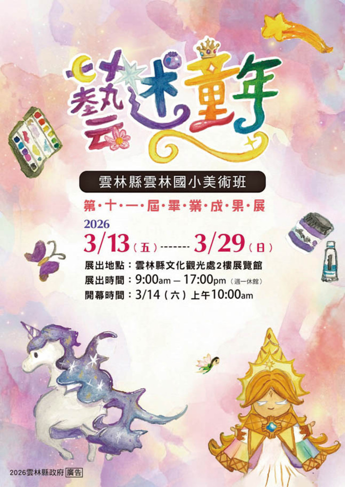 【記者譚國民/報導】雲林縣立雲林國民小學舉辦「雲林國小第11屆美術班『藝述童年』畢業教學成果展」,自115年3月13日(五)~3月29日(日)於文化觀光處展覽館2樓展出,並於3月14日(星期六)上午10時於文化觀光處1樓迴廊盛大開幕,歡迎雲林鄉親及各藝文愛好者屆時蒞臨參觀賜教!