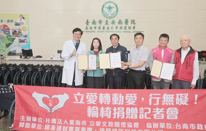 【記者潘智航/台南報導】為提升醫療院所服務量能並照顧行動不便民眾就醫需求,立愛文教關懷協會攜手國產建材實業集團捐贈130張輪椅予台南市4家急救責任醫院,於安南醫院醫療大樓1樓大廳舉行捐贈儀式。 台南市長黃偉哲出席見證並頒贈感謝狀,感謝民間團體長期關懷醫療服務與弱勢族群,攜手為市民打造更完善、友善的就醫環境。 黃偉哲表示,感謝立愛文教關懷協會長期投入公益服務,繼去年於安南醫院捐贈輪椅後,今年再次攜手企業關懷醫療需求,令人十分感佩。 他指出,台南是一座充滿愛心與行動力的城市,許多民間團體與市民朋友長期以實際行動回饋社會,共同讓城市更加溫暖、宜居。