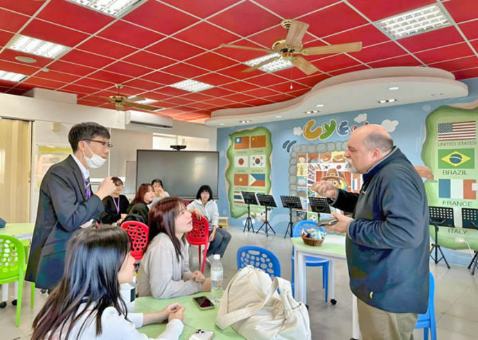 嘉大師範學院陳明聰院長與師生對香川大學訪團展現高度熱情,精心策劃涵蓋學前教育到國民小學的教學參訪活動,前往嘉義市民族國小、蘭潭國小及吳鳳幼兒園進行實地觀摩。 香川大學師生除參訪民族國小著名的英語村,見證臺灣在雙語教育上的投入成果,更進入蘭潭國小及吳鳳幼兒園教室與孩童互動,分享彼此的語言與生活點滴。 。