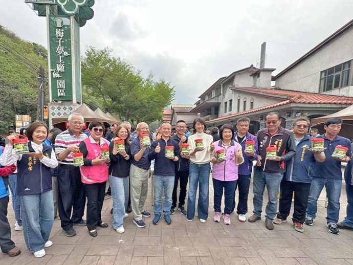 圖:南投縣長許淑華體驗青梅DIY動手製作脆梅與來賓合影。 (記者李光曜/攝)