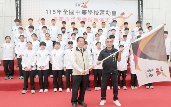 【記者吳淑華/台南報導】115年全國中等學校運動會將於4月18日至23日於嘉義縣舉行,台南市政府在永華市政中心舉行授旗儀式,由市長黃偉哲親自將市旗交予台南市體育總會理事長吳志祥,象徵台南市代表隊接旗出征。 黃偉哲期勉台南小將以最佳狀態迎戰全國好手,發揮訓練成果,在競技舞台上突破自我、再創佳績。 黃偉哲表示,去(114)年台南市睽違22年舉辦全中運,並創下48金、42銀、63銅、總計153面獎牌的歷史新高,成果亮眼。 今年賽會移師鄰近的嘉義縣舉辦,距離近、條件佳,更是台南隊再拚佳績的好機會。 他強調,選手們經過一年扎實訓練,應以「好還要更好」為目標,驗收努力成果,期許在本屆賽會中持續突破紀錄、爭取榮耀。