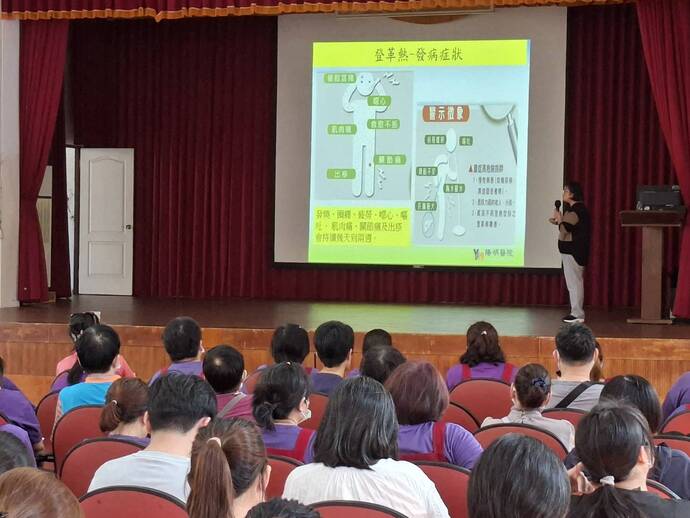 這次特別邀請陽明醫院感染管制師蔡衣玲來分享,課程中詳盡解說登革熱的傳播途徑、臨床症狀及病媒蚊的習性。 講師特別指導同仁們如何落實「巡、倒、清、刷」四大防疫要領,並針對潛在滋生源進行盤點,包括盆栽底盤、遮雨棚積水、廢棄容器及排水溝槽等容易被忽略的死角。